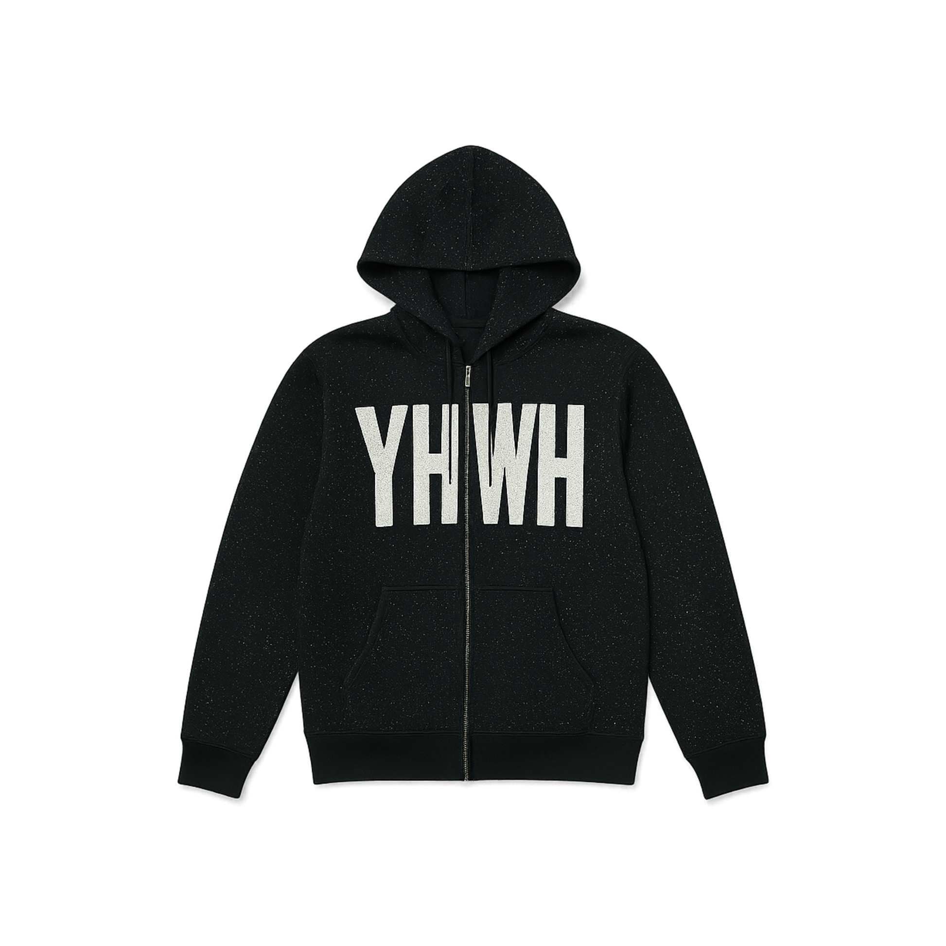 • Raw-edge applique “YHWH” lettering across the chest